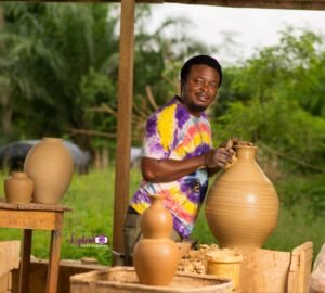 A man in a white shirt is placing a wheelchair into the back seat of a red car, while seated inside the vehicle. The scene takes place outdoors with sunlight visible.